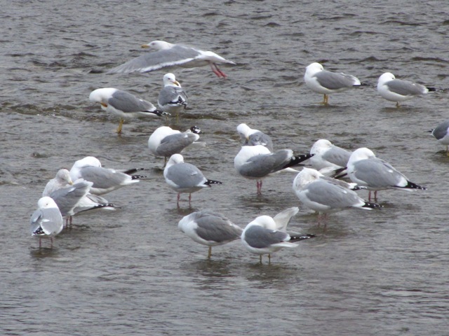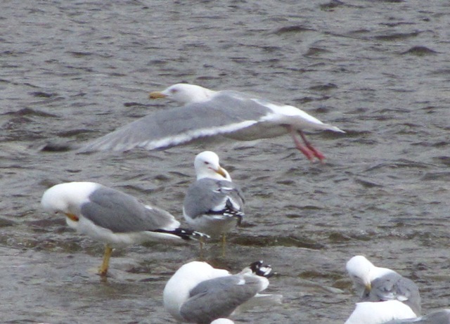 The gull in flight in the photos below was on the Bow River in Calgary on March 29, 2012. The first photo shows it in the company of Ring-billed, California, and Herring Gulls; the second is a cropped version of the first. Identifications proposed for it include Glaucous Gull, Glaucous-winged Gull, and a hybrid of those two species. Any other input is welcome.