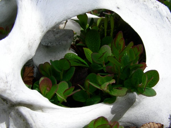 Bearberry growing inside an old bleached caribou pelvis, July 3