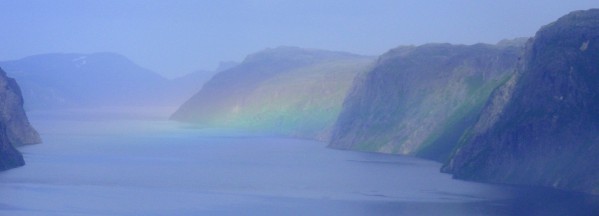 Horizontal rainbow in the mist over Harp Lake, July 3