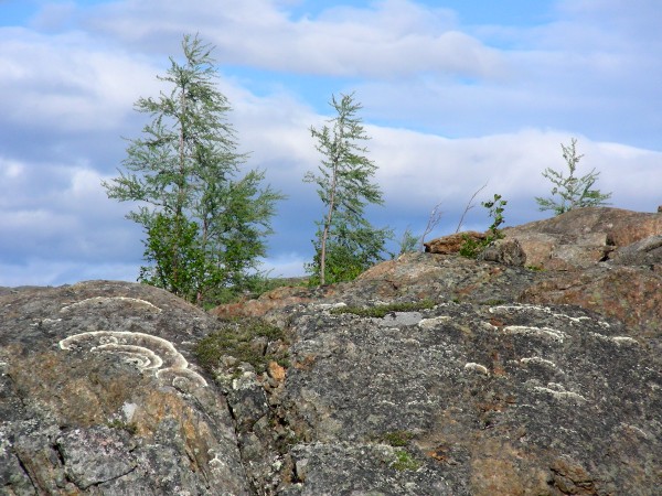 Hardy tamaracks growing on the rocky cliff tops, July 2