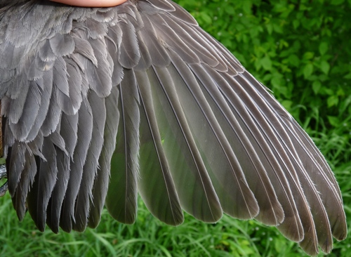 Note the contrast between the prematurely replaced outer feathers on the left side and