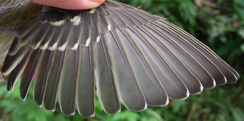The distinct moult limits (between primary coverts and greater coverts) on the wings below identifies these individuals as hatch-year Blackpoll Warblers, while the overall brown (vs. grayish-black) tone of the wing suggests they are females.