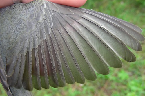 While the wing may appear somewhat worn by spring on Canada Warblers of all ages, the colour is relatively uniform gray on after-second-year birds.