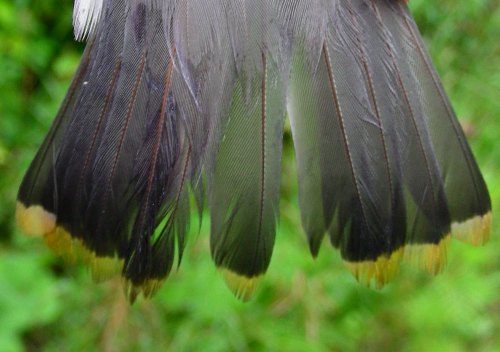 Although there is considerable overlap, AHY females on average have slightly shorter yellow tips on their rectrices than AHY males. While AHY rectrices are on average slightly more rounded at the tip, the difference is generally too slight to be of use for ageing.