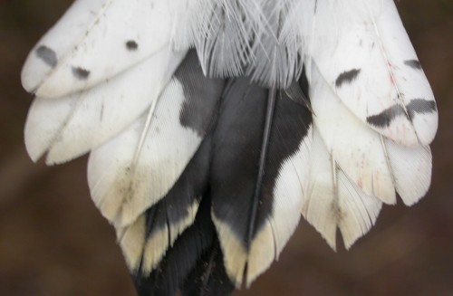 Primary coverts are an irregular mix of black (fresh), brown,