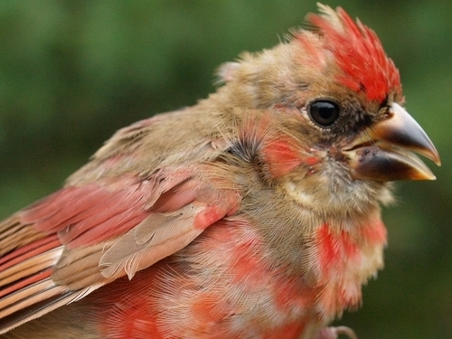 male Northern Cardinals are primarily red, but may have patches of retained