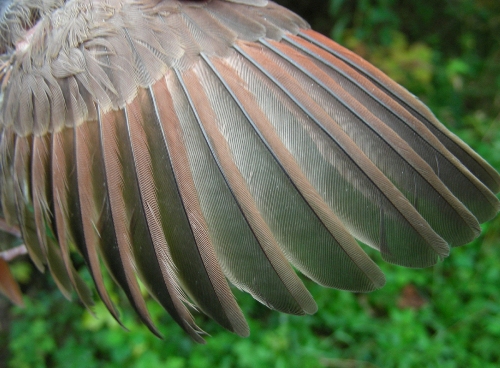 A closeup showing the contrast between the replaced inner primaries and outermost three