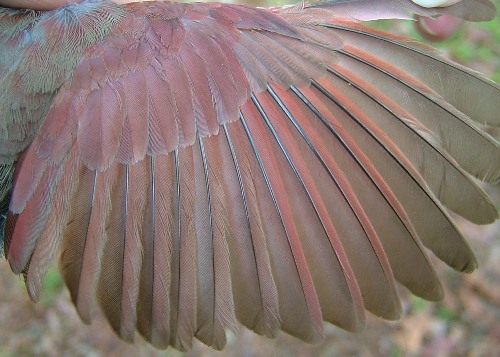 between the brownish primary coverts and replaced more reddish greater coverts.