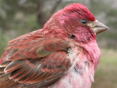 AHY Purple Finches have broad and rounded rectrices, and males are readily recognizable by the red rump.