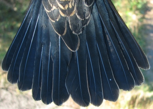 Tails are not generally useful for ageing blackbirds. The photos below show the undertail and top of a typical hatch-year tail.