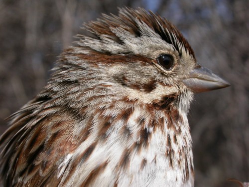 Ageing and sexing details: Body plumage does not provide any clues to age or sex in Song Sparrows. Sex can be determined only during the breeding season by brood patch or cloacal protuberance. The condition of the wing and tail can be assessed to determine age, although by spring the feathers have become worn enough that is often difficult to be certain, and many individuals are better called AHY.